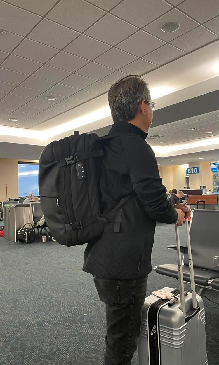 A tecnologia de compressão a vácuo da nossa mochila de viagem usa um sistema que remove todo o ar das suas roupas, permitindo que você vá de 29 L para 60 L num piscar de olhos, dependendo do que estiver levando.