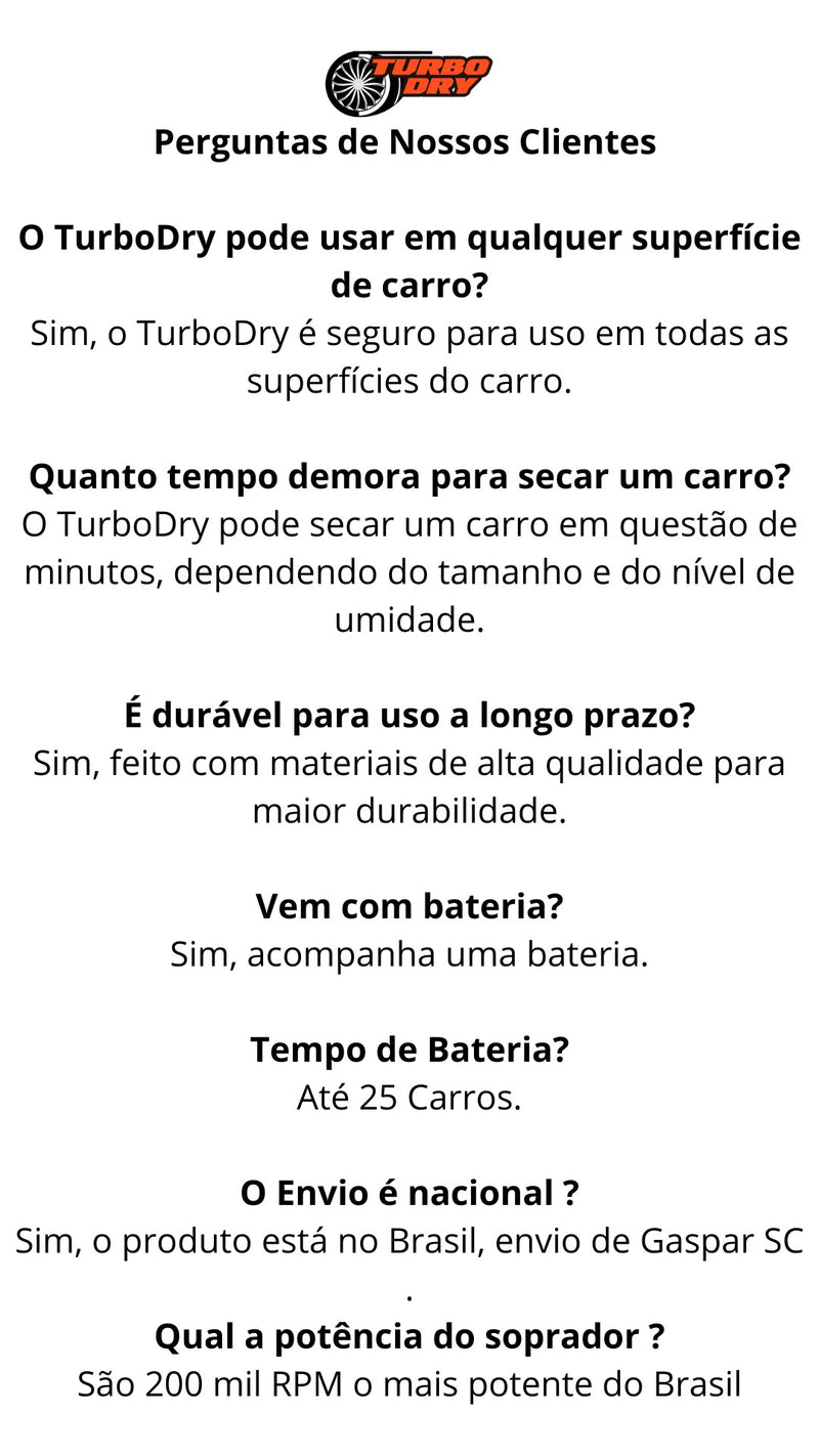 O TurboDry revoluciona a secagem de carros, eliminando rapidamente as gotas de água após a lavagem. É a solução definitiva para obter um acabamento impecável e seco em poucos minutos.